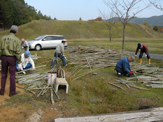 作業途中ですがこんな感じ。竹の上に乗っている木は上のせといって、竹の炭化の着火材といったところです。炭化は上から始まります。